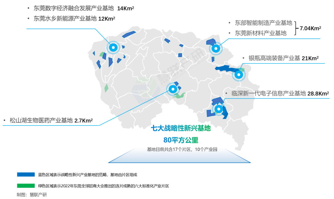 以上这七大战新基地的空间自2021年以来,东莞规划整合约60平方公里。在2022年全球招商大会,又推出连片成熟的六大标准化产业片区,面积25.6平方公里,这25.6平方公里的面积加到原先60平方公里的基础上,最终扩容形成至现在的80平方公里。