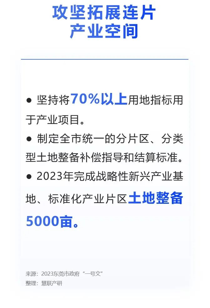 2023年,东莞市政府“一号文”《关于坚持以制造业当家 推动实体经济高质量发展的若干措施》提出,攻坚拓展连片产业空间,今年完成战略性新兴产业基地、标准化产业片区土地整备5000亩,其中300亩以上连片土地不少于3片。