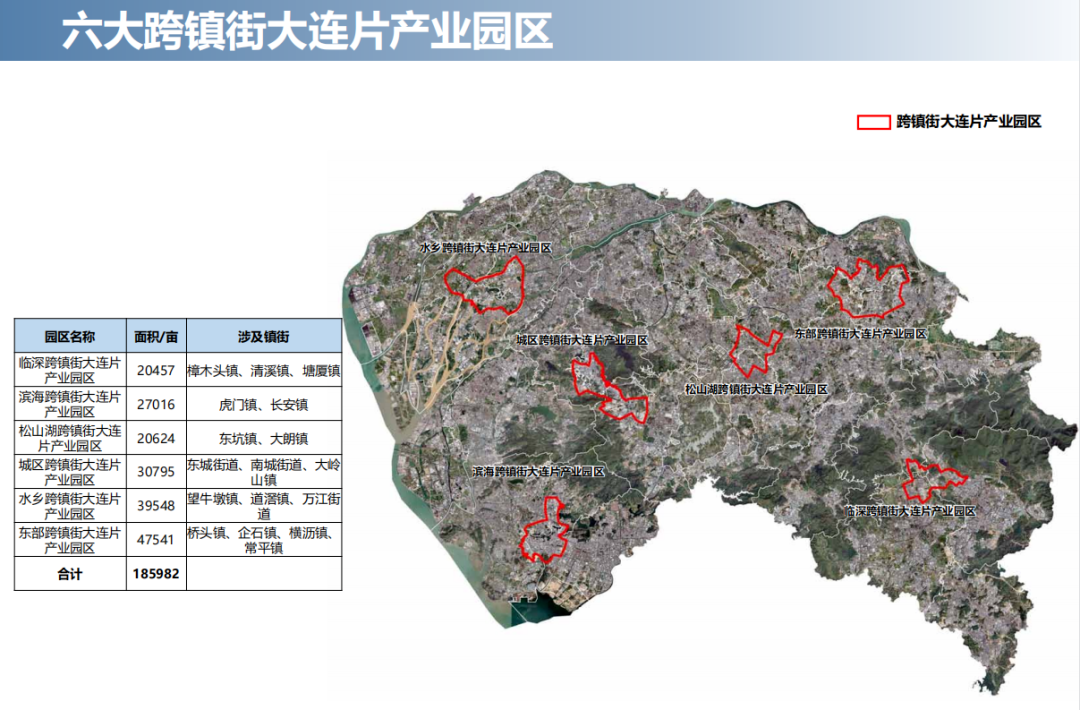 “60+6”现代化产业片区中,“6”指的是六大跨镇街连片产业园区,分别为临深跨镇街大连片产业园区、滨海跨镇街大连片产业园区、松山湖跨镇街大连片产业园区、城区跨镇街大连片产业园区、水乡跨镇街大连片产业园区、东部跨镇街大连片产业园区。合计18.59万亩。