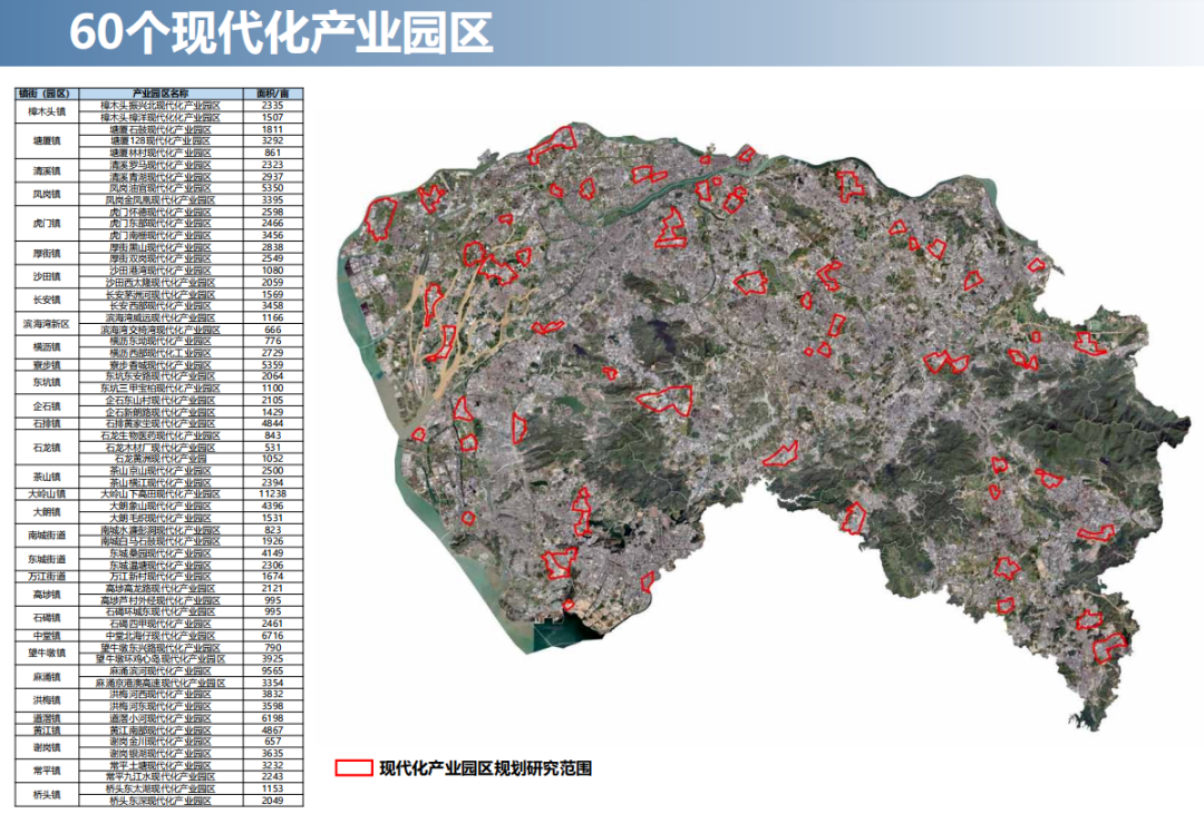 另外的60个现代化产业园区,分布在东莞32镇街(园区),合计16.4万亩。大部分处于初步划定状态,具体实施范围待片区统筹阶段深化研究后确定。