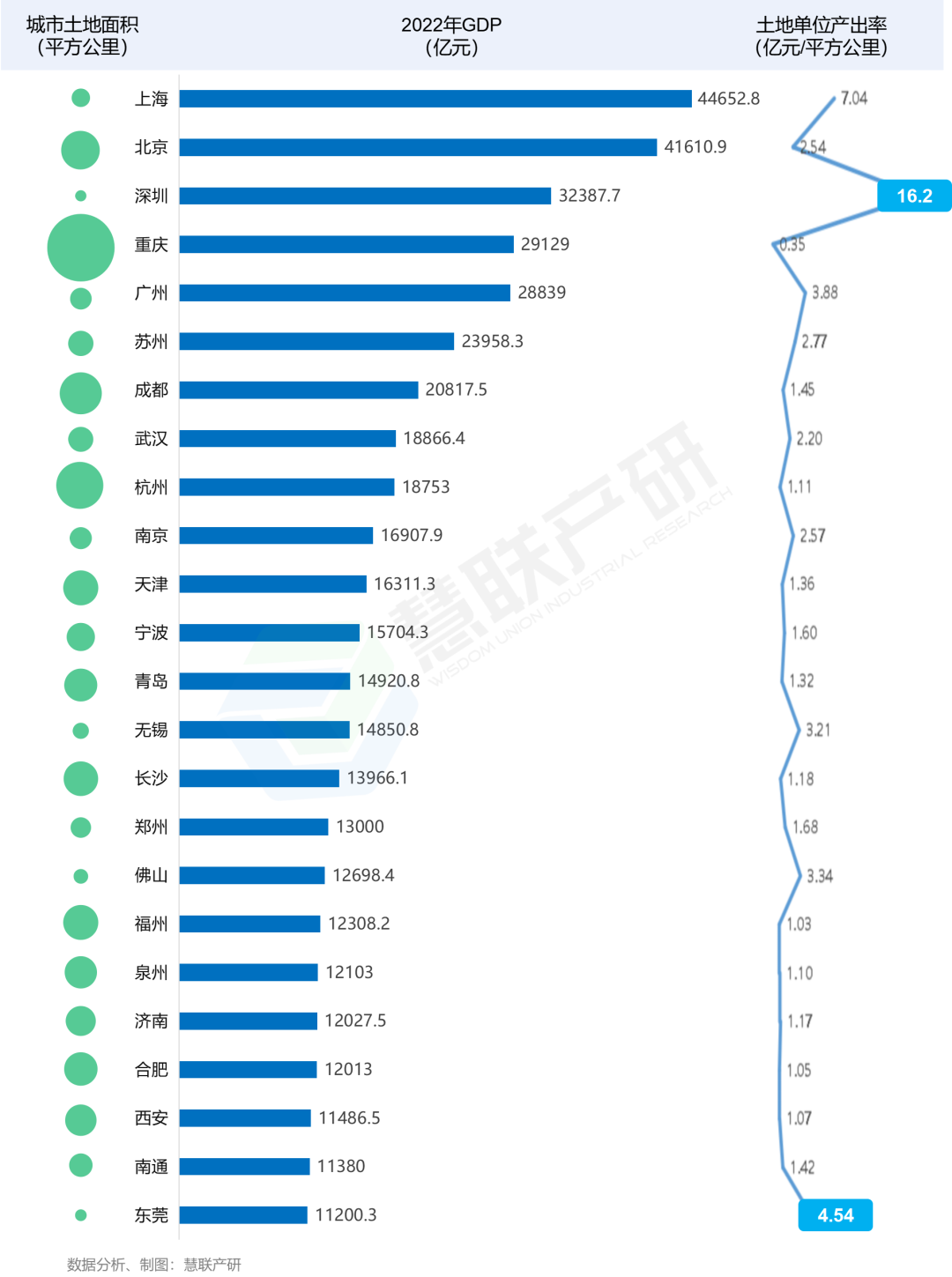 2022年全国双万城市面积及土地单位产出率对比