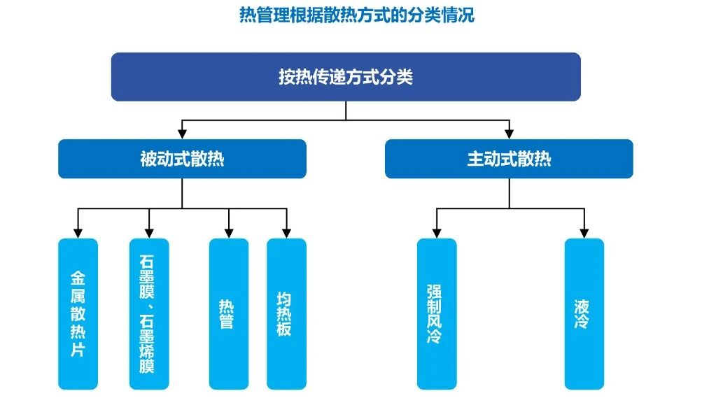热管理根据散热方式可分为被动式和主动式两大类。被动式散热不依靠动力元件,仅靠散热产品本身依靠其材料、结构特性进行散热,如金属散热片、导热石墨片、热管、均热板等。主动式散热是采取与发热体无关的动力元件进行强制散热,主要包括强制风冷和液冷。