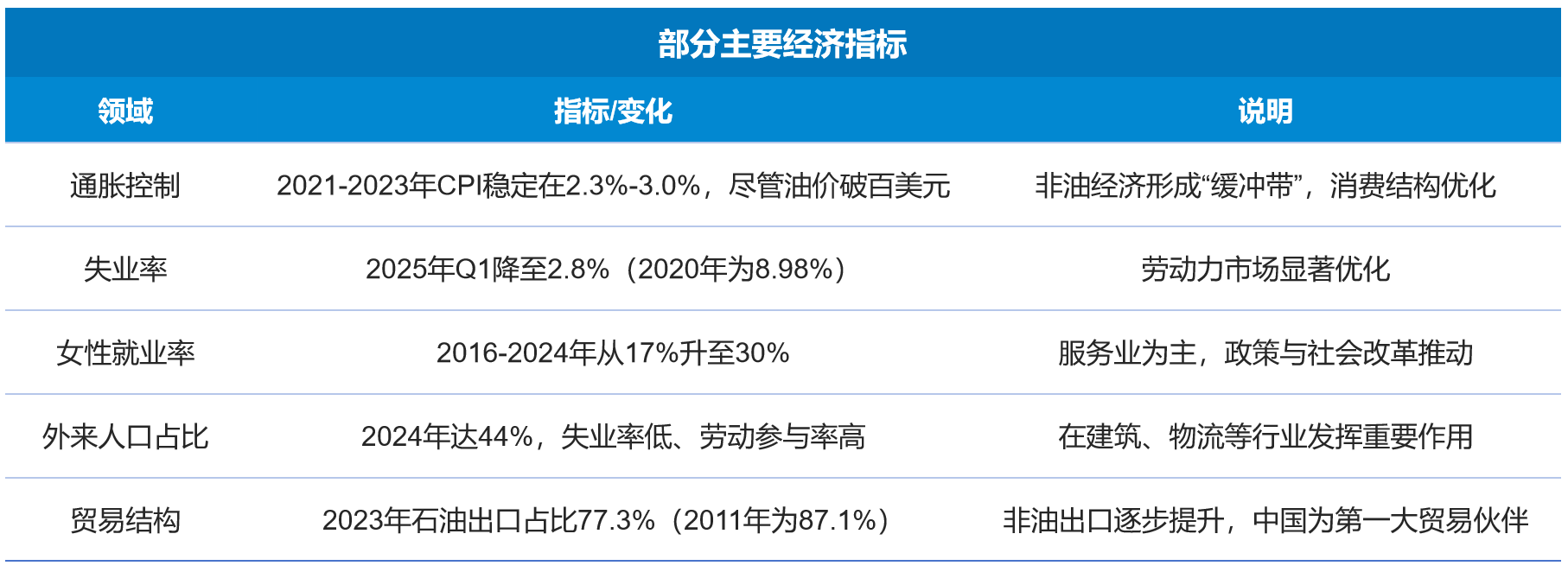 从增长动力看,沙特正从“出口拉动”转向“内需驱动”。2023年居民消费增速达7.7%,投资增速维持9.4%,基建、文旅等领域扩张明显;而出口受油价波动影响较大,2023年因油价回落同比降7%。收入结构上,沙特仍呈“资本密集型”特征:2023年营业盈余占GDP60.1%(国际主流经济体多为35%-45%),劳动者报酬占比25%(美国等发达经济体约50%-55%),反映出能源、重工业等资本回报高的部门仍占主导,人力资本提升与高附加值服务业发展空间较大。