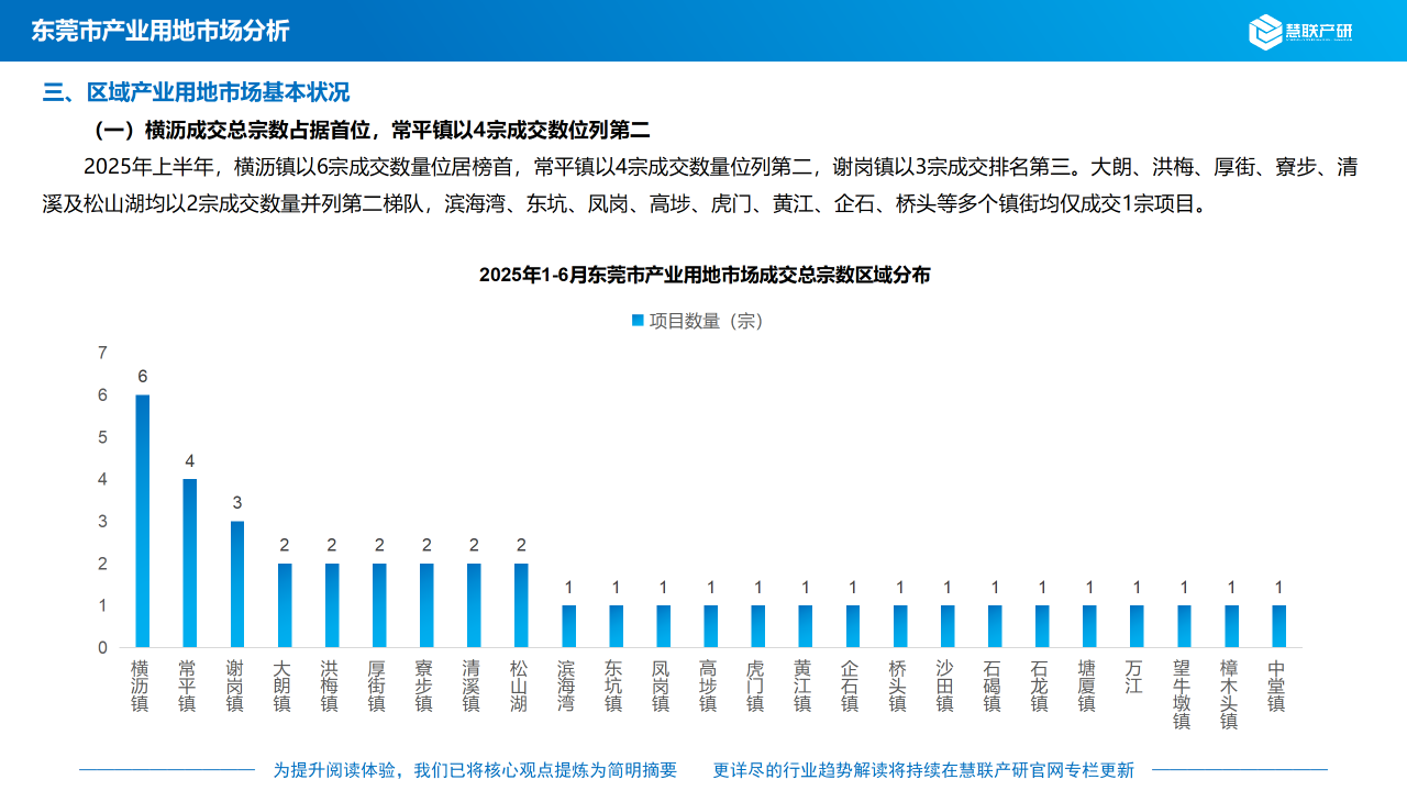 2025年上半年,横沥镇以6宗成交数量位居榜首,常平镇以4宗成交数量位列第二,谢岗镇以3宗成交排名第三。大朗、洪梅、厚街、寮步、清溪及松山湖均以2宗成交数量并列第二梯队,滨海湾、东坑、凤岗、高埗、虎门、黄江、企石、桥头等多个镇街均仅成交1宗项目。