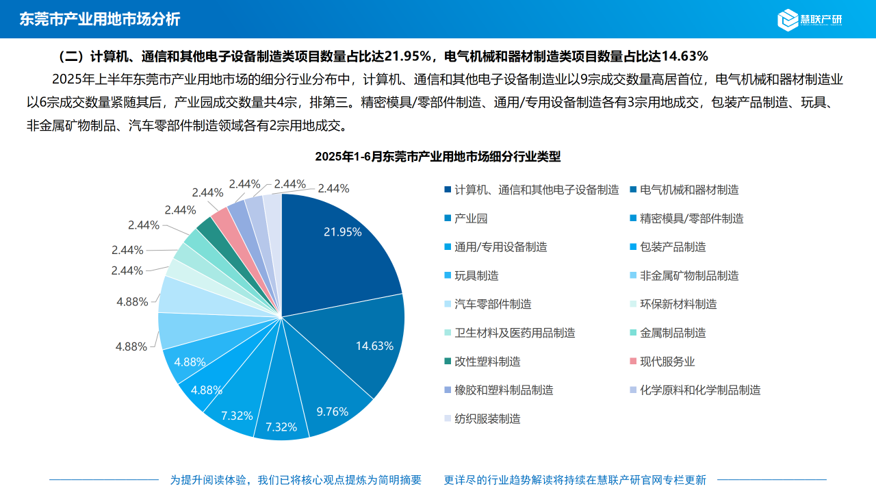2025年上半年东莞市产业用地市场的细分行业分布中,计算机、通信和其他电子设备制造业以9宗成交数量高居首位,电气机械和器材制造业以6宗成交数量紧随其后,产业园成交数量共4宗,排第三。精密模具/零部件制造、通用/专用设备制造各有3宗用地成交,包装产品制造、玩具、非金属矿物制品、汽车零部件制造领域各有2宗用地成交。