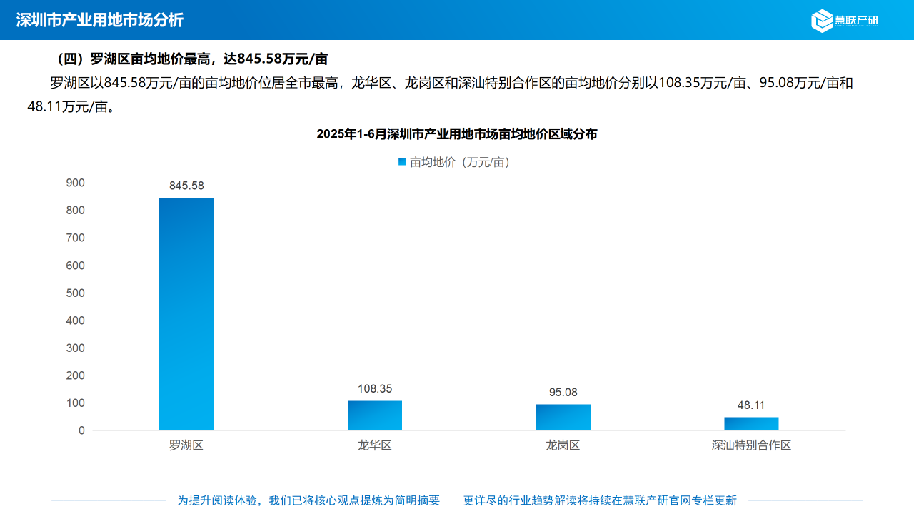 2025年上半年,深汕特别合作区产业用地市场成交总宗数为4宗,均占据首位;龙华区成交宗数为2宗,排名第二;龙岗区和罗湖区成交宗数均为1宗。