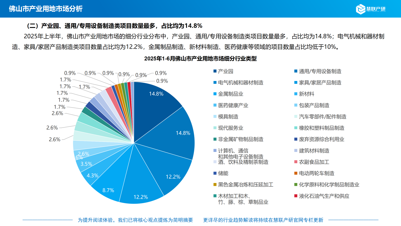 2025年上半年,佛山市产业用地市场的细分行业分布中,产业园、通用/专用设备制造类项目数量最多,占比均为14.8%;电气机械和器材制造、家具/家居产品制造类项目数量占比均为12.2%,金属制品制造、新材料制造、医药健康等领域的项目数量占比均低于10%。