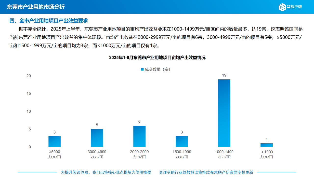 据不完全统计,2025年上半年,东莞市产业用地项目的亩均产出效益要求在1,000-1,499万元/亩区间内的数量最多,达19宗,这表明该区间是当前东莞产业用地项目产出效益的集中体现段。亩均产出效益在2,000-2,999万元/亩的项目有6宗,3,000-4,999万元/亩的项目有5宗,≥5,000万元/亩和1,500-1,999万元/亩的项目均为3宗,而<1,000万元/亩的项目仅有1宗。