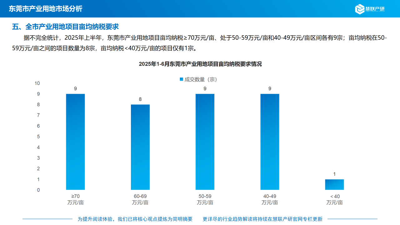 据不完全统计,2025年上半年,东莞市产业用地项目亩均纳税≥70万元/亩、处于50-59万元/亩和40-49万元/亩区间各有9宗;亩均纳税在50-59万元/亩之间的项目数量为8宗,亩均纳税<40万元/亩的项目仅有1宗。