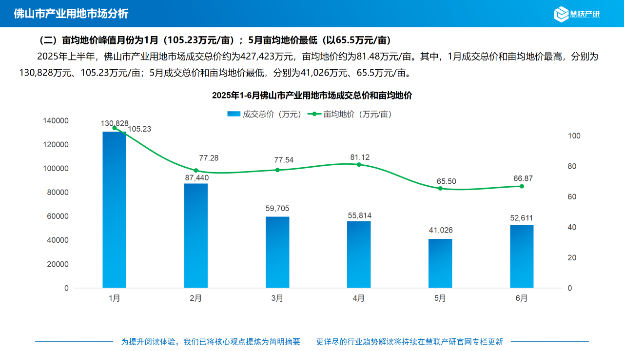 2025年上半年,佛山市产业用地市场成交总价约为427,423万元,亩均地价约为81.48万元/亩。其中,1月成交总价和亩均地价最高,分别为130,828万元、105.23万元/亩;5月成交总价和亩均地价最低,分别为41,026万元、65.5万元/亩。