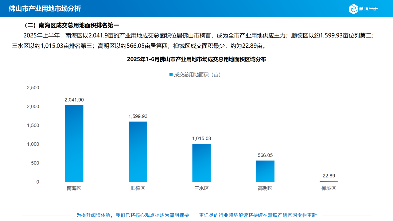 2025年上半年,南海区以2,041.9亩的产业用地成交总面积位居佛山市榜首,成为全市产业用地供应主力;顺德区以约1,599.93亩位列第二;三水区以约1,015.03亩排名第三;高明区以约566.05亩居第四;禅城区成交面积最少,约为22.89亩。