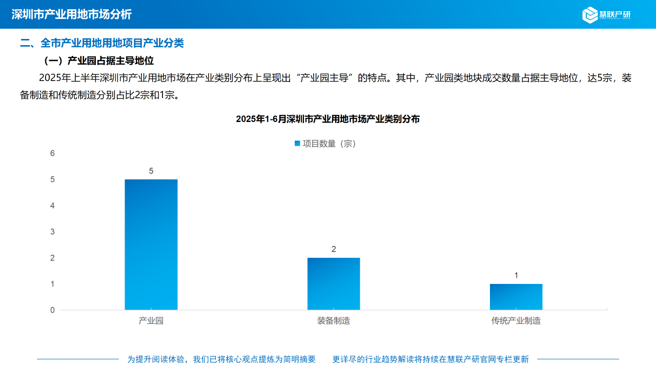 2025年上半年深圳市产业用地市场在产业类别分布上呈现出“产业园项目主导”的特点。其中,产业园类地块成交数量占据主导地位,达5宗,装备制造和传统制造分别为2宗和1宗。