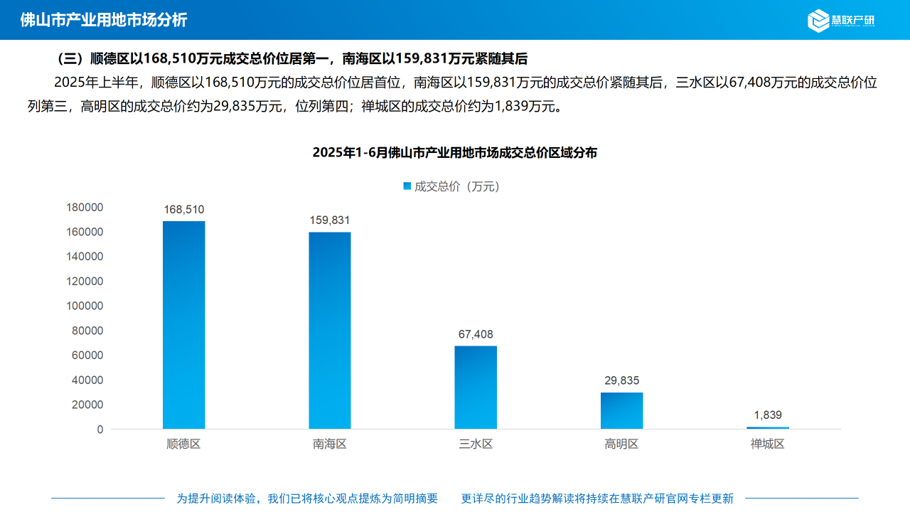 (三)顺德区以168,510万元成交总价位居第一,南海区以159,831万元紧随其后