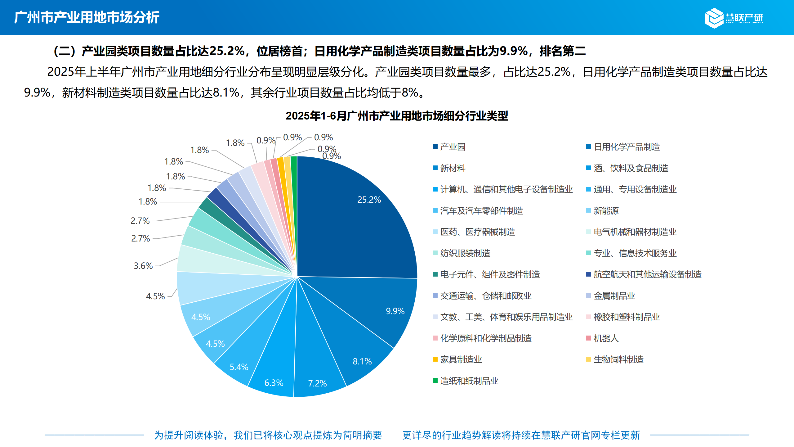2025年上半年广州市产业用地细分行业分布呈现明显层级分化。产业园类项目数量最多,占比达25.2%,日用化学产品制造类项目数量占比达9.9%,新材料制造类项目数量占比达8.1%,其余行业项目数量占比均低于8%。
