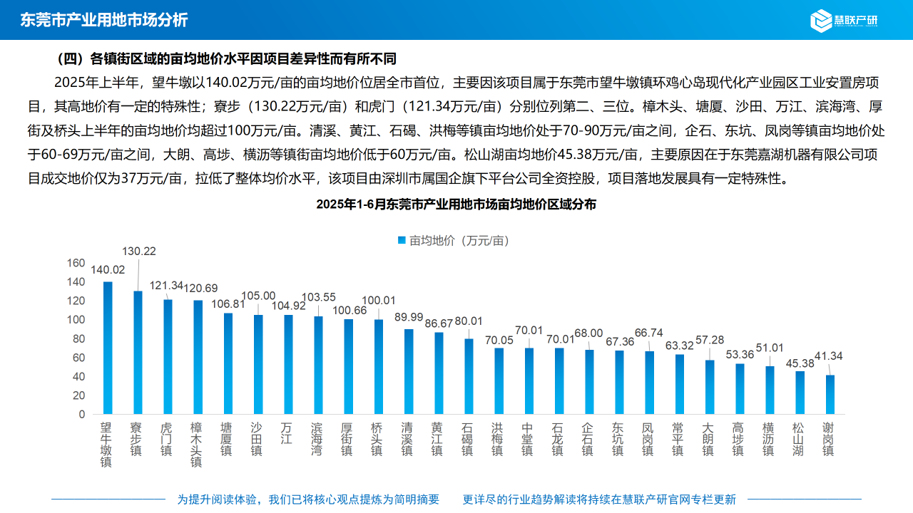 2025年上半年,望牛墩以140.02万元/亩的亩均地价位居全市首位,主要因该项目属于东莞市望牛墩镇环鸡心岛现代化产业园区工业安置房项目,其高地价有一定的特殊性;寮步(130.22万元/亩)和虎门(121.34万元/亩)分别位列第二、三位。樟木头、塘厦、沙田、万江、滨海湾、厚街及桥头上半年的亩均地价均超过100万元/亩。清溪、黄江、石碣、洪梅等镇亩均地价处于70-90万元/亩之间,企石、东坑、凤岗等镇亩均地价处于60-69万元/亩之间,大朗、高埗、横沥等镇街亩均地价低于60万元/亩。松山湖亩均地价45.38万元/亩,主要原因在于东莞嘉湖机器有限公司项目成交地价仅为37万元/亩,拉低了整体均价水平,该项目由深圳市属国企旗下平台公司全资控股,项目落地发展具有一定特殊性。