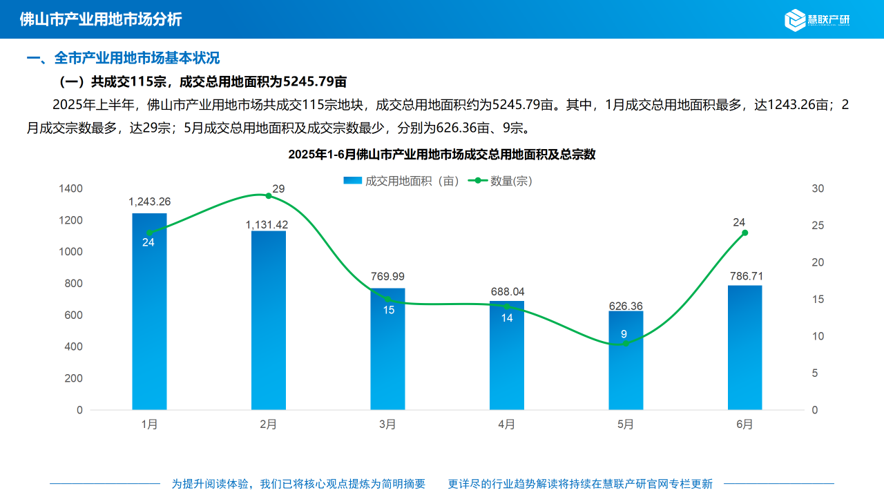 2025年上半年,佛山市产业用地市场共成交115宗地块,成交总用地面积约为5,245.79亩。其中,1月成交总用地面积最多,达1,243.26亩;2月成交宗数最多,达29宗;5月成交总用地面积及成交宗数最少,分别为626.36亩、9宗。