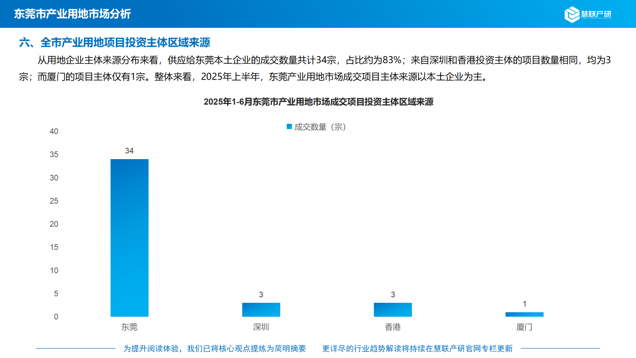 从用地企业主体来源分布来看,供应给东莞本土企业的成交数量共计34宗,占比约为83%;来自深圳和香港投资主体的项目数量相同,均为3宗;而厦门的项目主体仅有1宗。整体来看,2025年上半年,东莞产业用地市场成交项目主体来源以本土企业为主。
