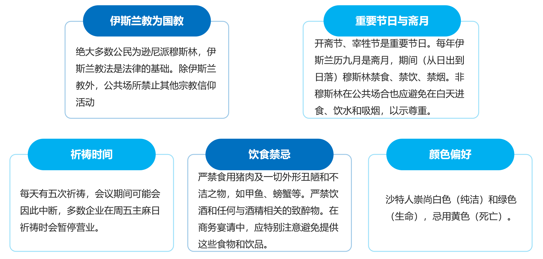 当地文化风俗宗教等禁忌:在考察期间,务必严格遵守当地宗教习俗与法律法规以确保行程顺利。宗教与社会习俗方面,需注意公共场所严禁饮酒和携带猪肉制品,穿着需得体保守,避免暴露,尤其参观清真寺等场所;黄色被视为禁忌颜色,需避免在礼品或包装中使用;社交礼仪上,尽量使用右手进行递物、进食等,并避免随意触碰他人头部或拍摄当地民众;商务与公共规范方面,请合理安排日程以避开每日五次祈祷时间及周五主麻日,勿对政府、军事设施拍照,并遵守当地交通规则,行人过马路务必走斑马线。