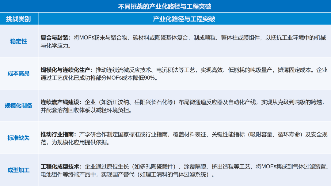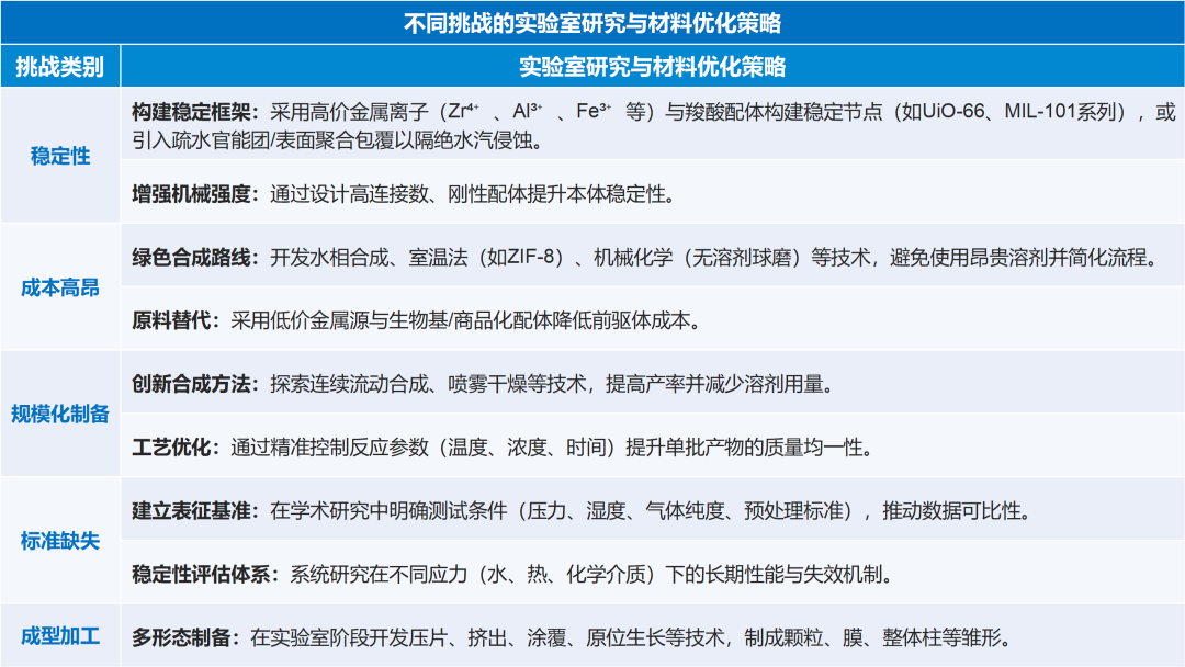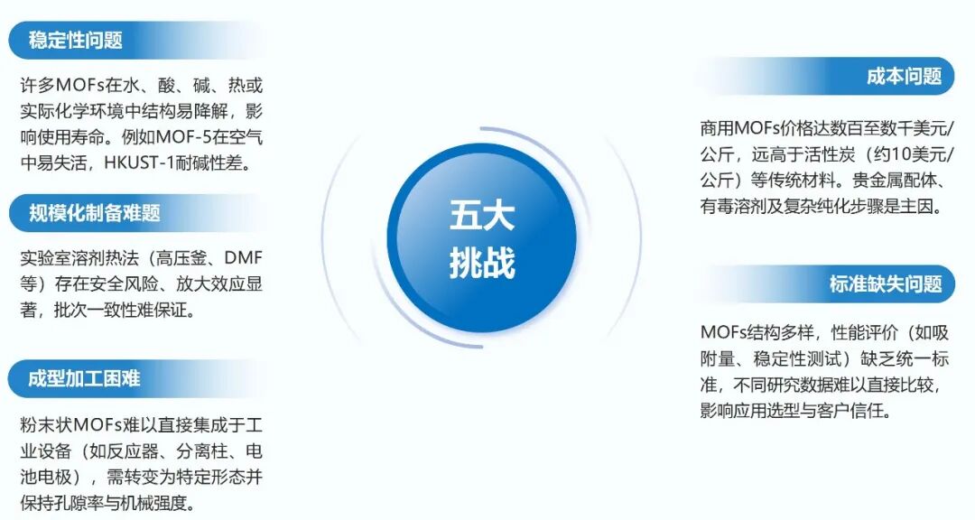 尽管MOFs前景广阔,但从毫克级烧杯走向万吨级工厂,仍需跨越五大现实挑战: