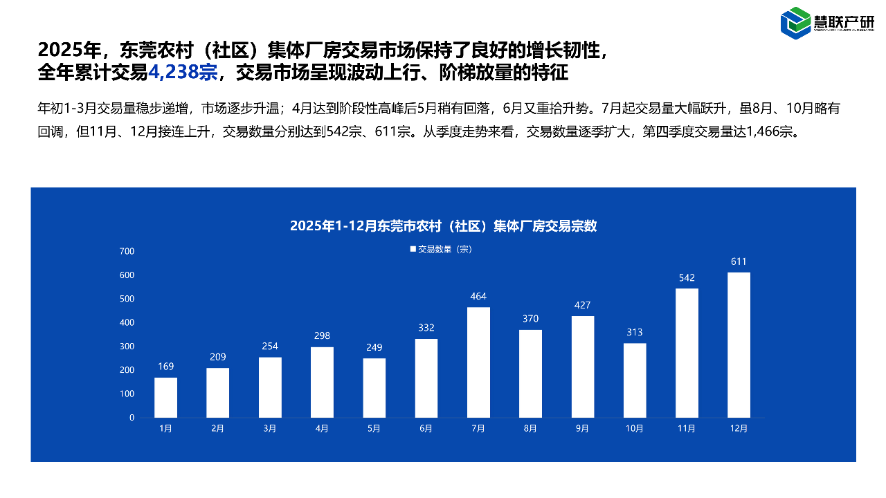 【交易规模方面】2025年,东莞农村(社区)集体厂房交易市场保持了良好的增长韧性,全年累计交易4,238宗,交易市场呈现波动上行、阶梯放量的特征。