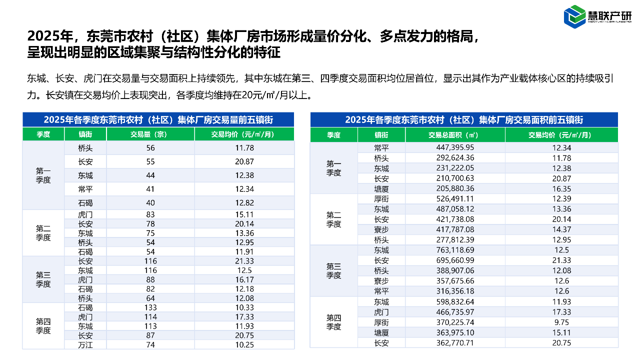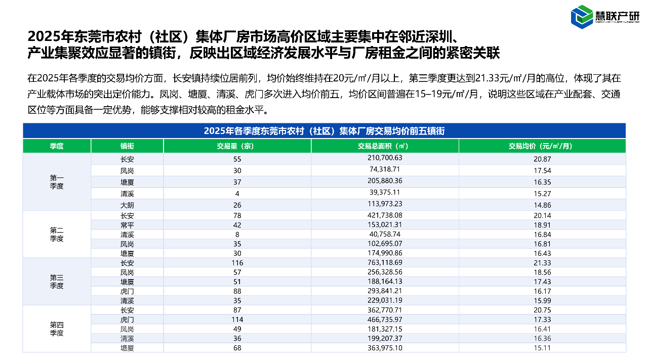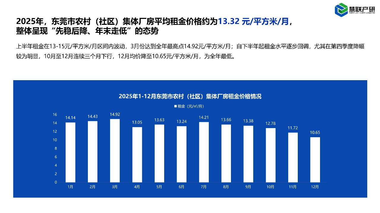 【交易价格方面】2025年,东莞市农村(社区)集体厂房平均租金价格约为13.32 元/平方米/月,整体呈现“先稳后降、年末走低”的态势。